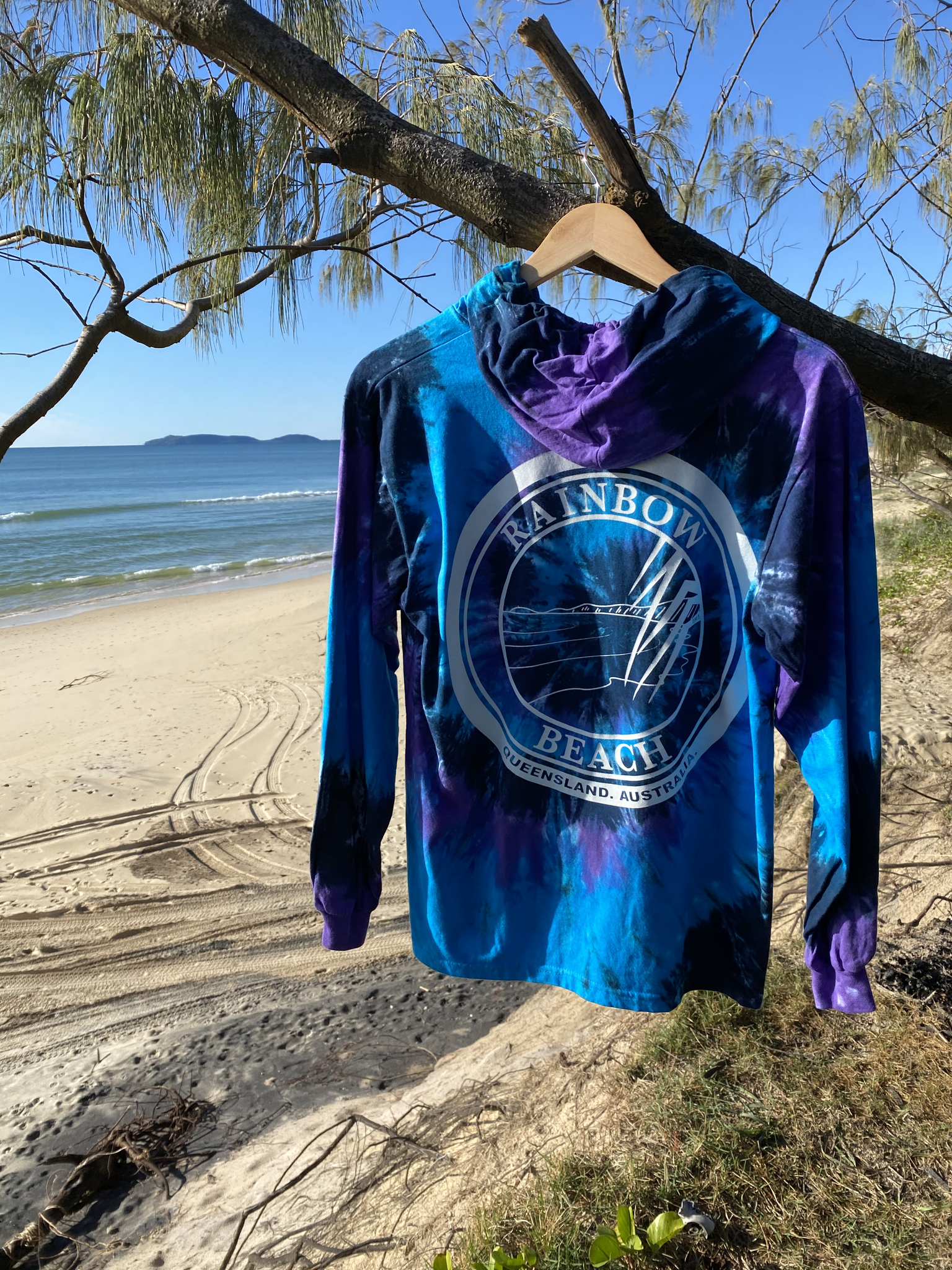 Show your love for Rainbow Beach in winter with this amazing Tie Dye Hoodies! They are a lightweight hoodie meaning you can wear them more often. Made from soft, breathable cotton, it features a unisex fit and a design inspired by the surf at Rainbow Beach. Available in only the Blue and Purple Tie Dye. Perfect for days when it's just a little too cold for a regular t-shirt.
